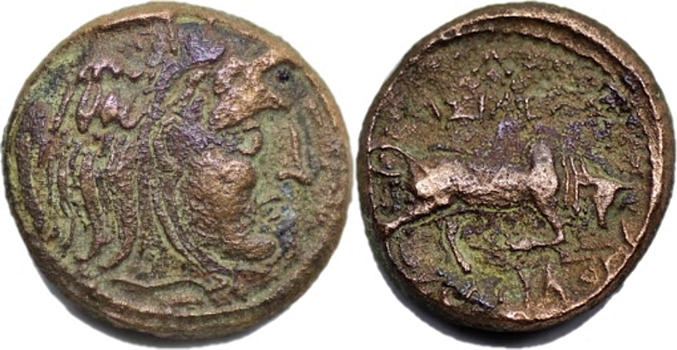 SELEUKID KINGDOM. Seleukos I Nikator (312-281 BC). Ae. Sardes (5.34g/ 15mm). Obv: Winged head of Medusa right/ Rev: BAΣIΛEΩΣ / ΣΕΛΕΥΚOY. Bull butting right. Controls: Monogram above, crescent below. SC 6 var. (controls); HGC 9, 107a. Very fine, original patina.