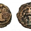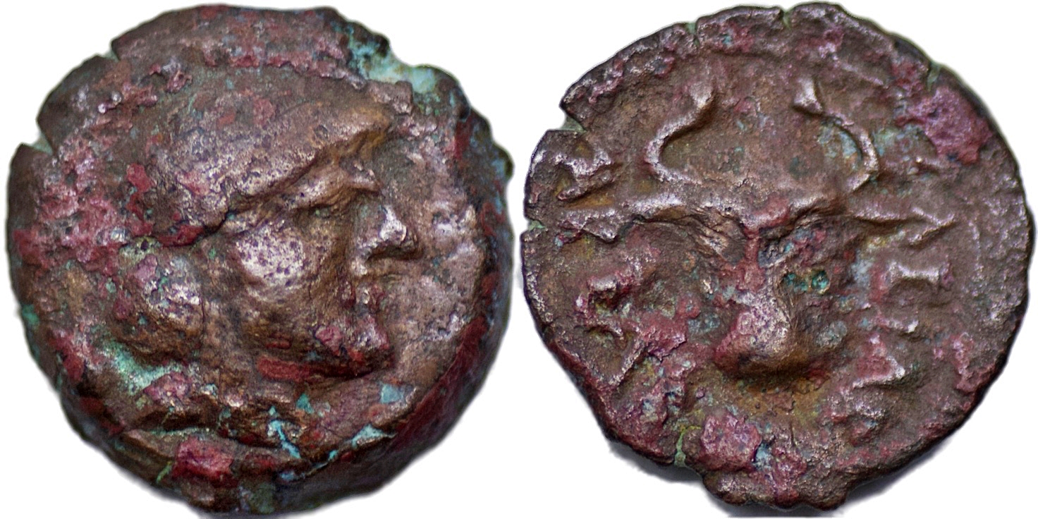PARTHIAN EMPIRE. Phraates II (138-127 B.C.) AE Chalkous ( 2.50g/ 14mm). lightly-bearded bust right, wearing diadem; irregular die axes; circular reel and pellet border/ head of bull facing; [border?]; two-line Greek inscription = ΒΑΣΙΛΕΩΣ ΑΡΣΑΚΟΥ. Sellwood 14.6 . Very RARE.