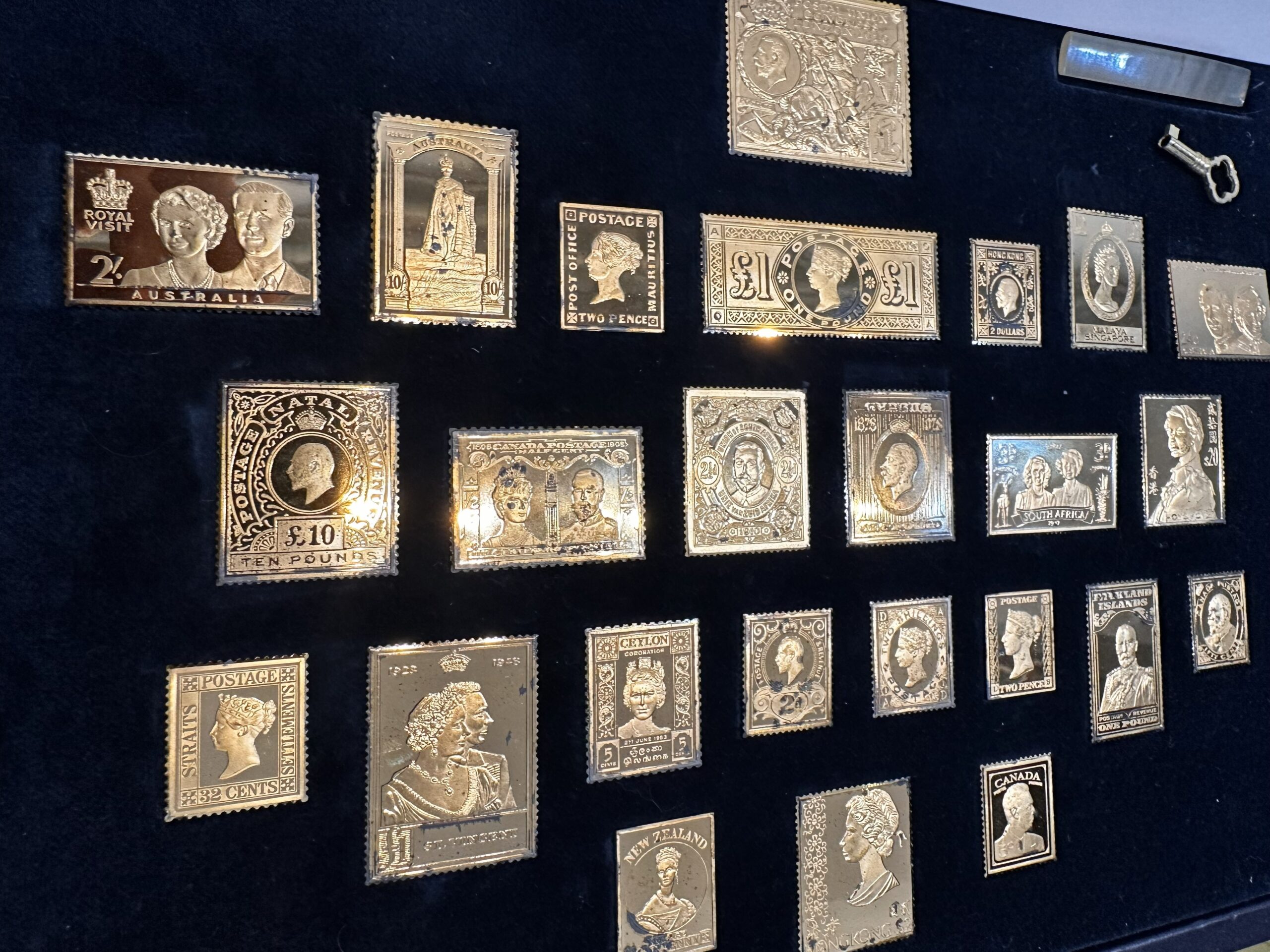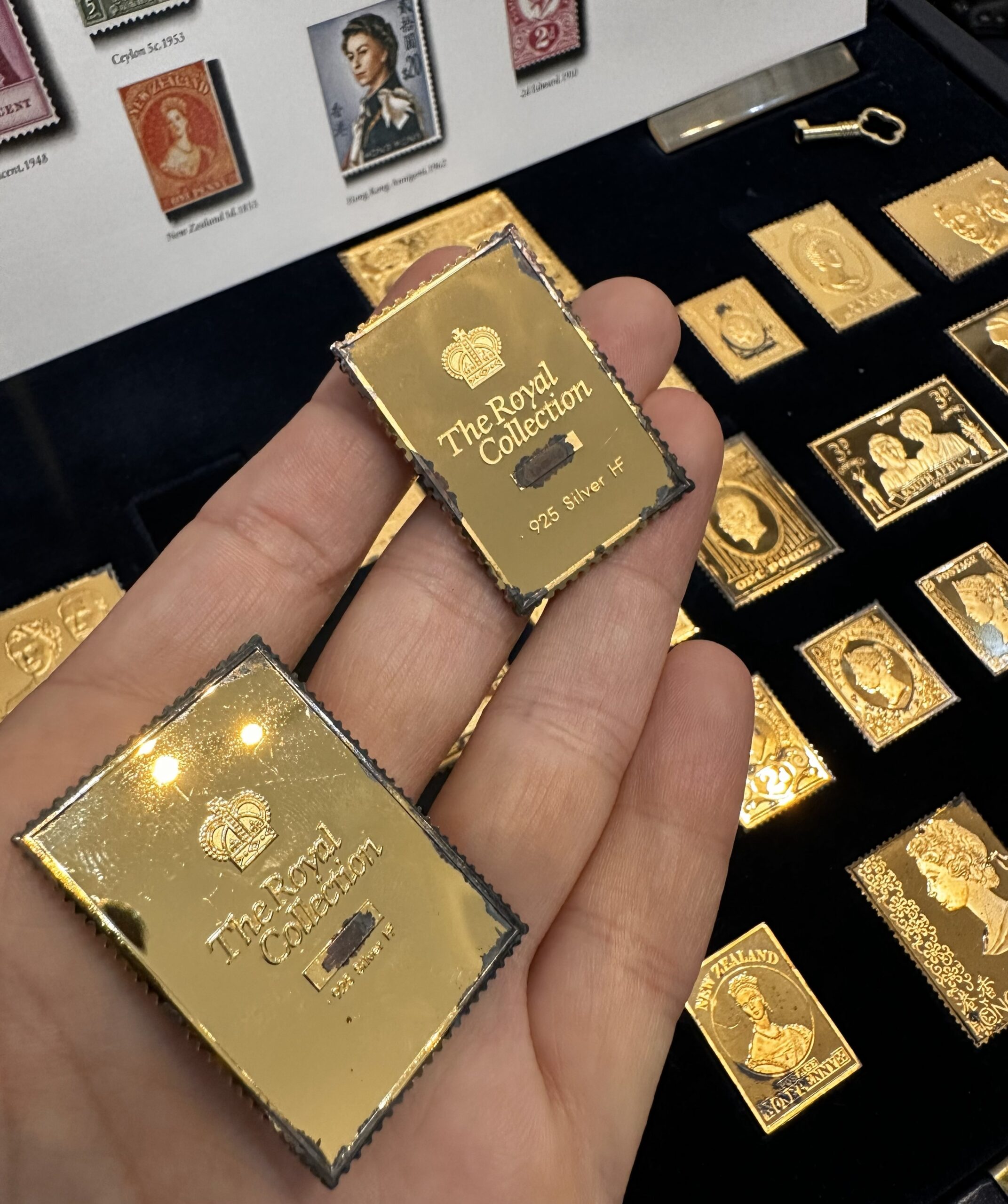 The Royal Collection hallmarked silver-gilt stamps. released by Hallmark Replicas Ltd 1981. Consist of 25 gold plated sterling silver (.925) stamps. Total weight approx. 460g (425 pure silver). The set comes in a fitted presentation case and key, with accompanying certificates or documentation.