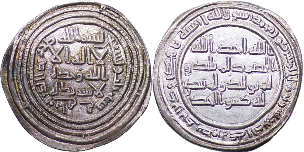 UMAYYAD: al-Walid I, 705-715, AR dirham (2.93g/ 27mm), Mahayy, AH93, A-128, Klat-559, EF. Toned with a beautiful patina on the obverse.