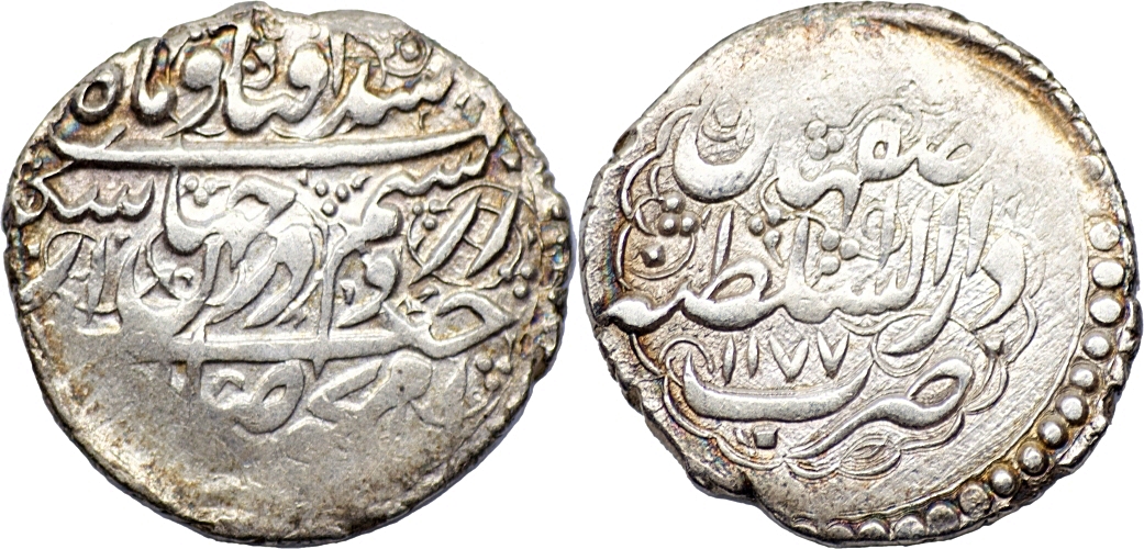 ZAND: Karim Khan, 1753-1779, AR Abbasi (4.61g/ 21mm), Isfahan, AH1177, A-2799 type B. Beautiful toning and Very fine. Ex Stephen album inventory.